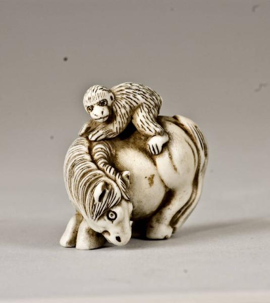 Netsuke in porcellana invetriata raffigurante un cavallo (uma) sulla groppa del quale sta posata una scimmia (saru). I due fori dell'himotoshi, uno di dimensioni maggiori rispetto all'altro, si trovano su un fianco del cavallo, disposti in verticale.