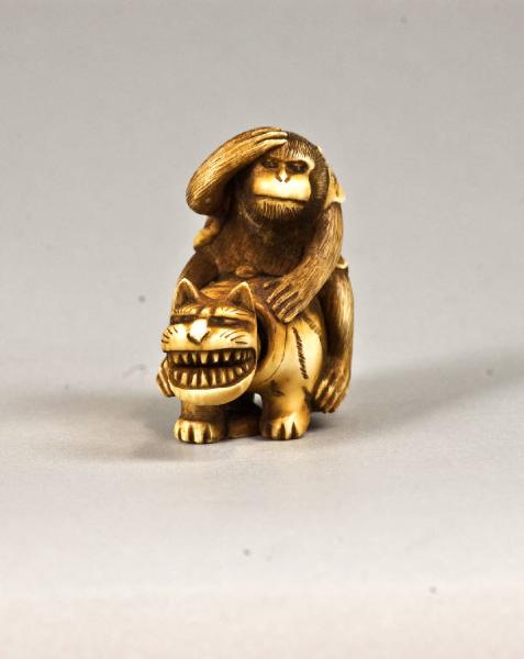 Il Lanfranchi aveva inserito questo okimono nella sezione dei "Giocattoli", poiché la testa della tigre (tora) è mobile; una scimmia (saru) sta seduta in groppa al felino, con la mano destra sulla fronte; indossa una casacca smanicata decorata sul retro con rametti di pino (matsu).