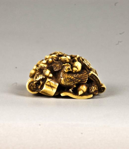 Questo compatto netsuke raffigura un'affollata composizione con un gallo (niwatori), una gallina, alcuni pulcini e una testa di oni, elementi tutti disposti su una serie di tegole, tra le quali spuntano rami fogliati di paulonia (kiri).