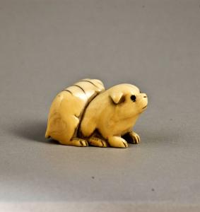 Netsuke raffigurante un cane (inu) sul cui dorso si arrampica un cucciolo. Gli occhi sono intarsi di corno. I due fori dell'himotoshi si trovano sul lato inferiore della composizione.