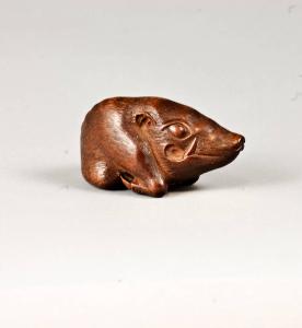 Okimono raffigurante un cinghiale (inoshishi) sdraiato, con le zampe anteriori piegate sotto il ventre.