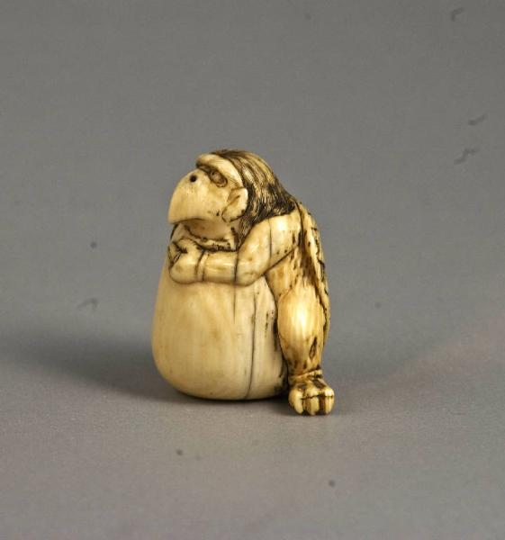 Okimono raffigurante un karasu-tengu in procinto di uscire dall'uovo, con becco e ali di uccello, capelli lunghi e tre artigli per ogni zampa.