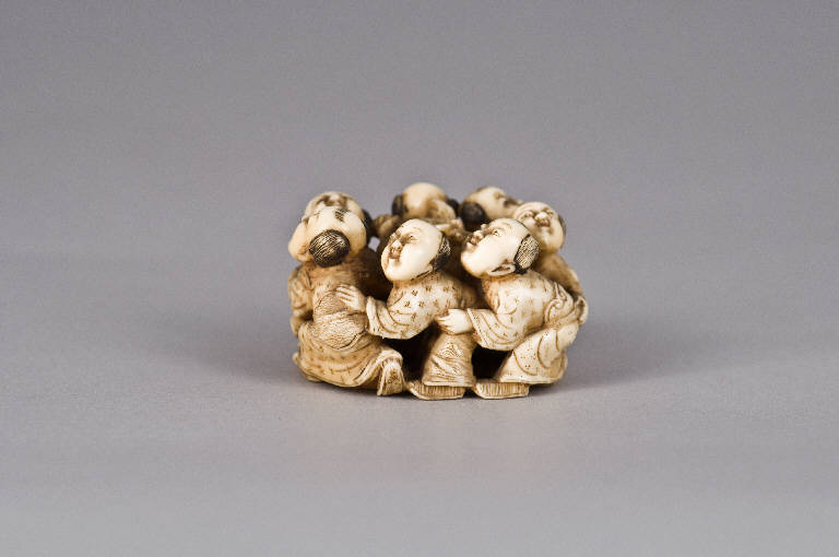 I sette "bambini cinesi" (karako) si tengono l'un con l'altro all'altezza dei fianchi, chi stringendo l'obi, chi posando solo le mani sul bambino che lo precede; il girotondo è interrotto da uno dei karako che si gira frontalmente per abbracciare un altro bambino; uno di loro tiene un ventaglio rigido (uchiwa). Sotto, tra i piedi, sono visibili alcuni oggetti: la maschera di un personaggio maschile con baffi, barba e un'espressione irata, ancora un ventaglio rigido, un tamburo e un corno.