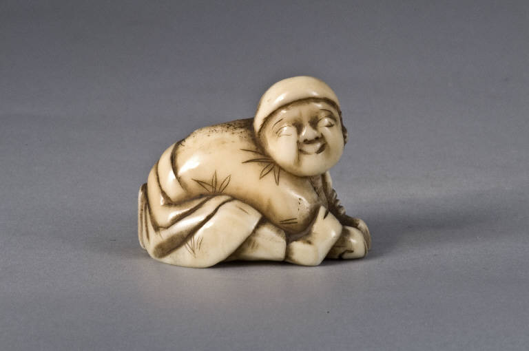 Il bambino, con le palpebre abbassate e quindi forse cieco, è sorridente; in testa porta un copricapo che aderisce al capo e indossa un ampio abito decorato con foglie stilizzate. Sta seduto, ripiegato su se stesso, con i piedi allungati a toccare le braccia distese in avanti.
