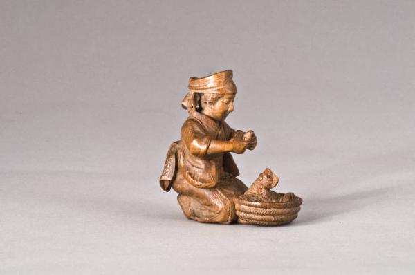 La donna, con la testa fasciata all'altezza della fronte dalla bandana hachimaki, di solito indossata per i lavori faticosi, tiene tra le mani un pulcino, mentre una gallina è sistemata nella cesta ai suoi piedi. Verso i fianchi si vedono due borse portate con una cinta 'alla bandoliera'; l'obi forma un vistoso fiocco sul retro. I due fori dell'himotoshi sono sistemati sotto la composizione, tra le ginocchia della donna il più piccolo e in corrispondenza della cesta il più grande.