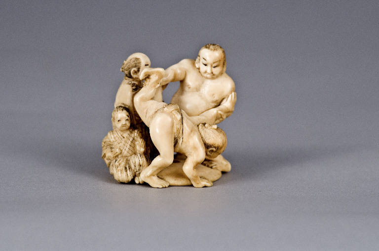 Tanikaze, campione di sumo, con un avversario e due uomini. UOMINI