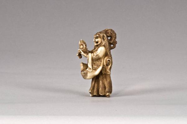 Netsuke raffigurante un attore di teatro No nel ruolo di Hannya; la figura demoniaca sembra procedere in avanti; tra le mani tiene un vassoio colmo di alcune perle fiammeggianti (hoju no tama); sul retro della testa, ornata da una lunghissima capigliatura che raggiunge i piedi, sta avvinghiato un draghetto. I due fori dell'himotoshi, uno di dimensioni maggiori rispetto all'altro, si trovano sul retro della figura, all'altezza della vita.