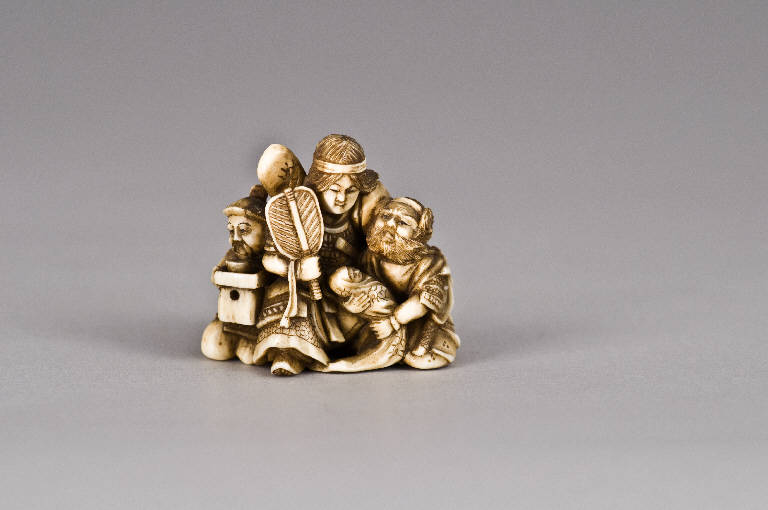 Netsuke raffigurante una composizione con al centro, in piedi, l'imperatrice Jingo, una fascia di tessuto per legare i lunghi capelli sciolti, un ventaglio rigido (uchiwa) nella mano destra e una spada (katana) nella mano sinistra, dietro le spalle; alla sua destra il fido Takenouchi no Sukune, dalla lunga barba, sostiene con le braccia un neonato, il futuro imperatore Ojin, avvolto in un tessuto; infine, un arciere inginocchiato protegge le spalle della sovrana.