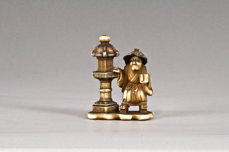 Questo okimono presenta, sistemata su una piattaforma a contorno frastagliato, una composizione con una lampada da giardino sulla quale posa la sua mano destra un personaggio maschile stante, vestito di un ampio abito allacciato in vita, in testa un cappello di paglia e nella mano sinistra un bricco contente l'olio per alimentare la fiamma del lampione.
