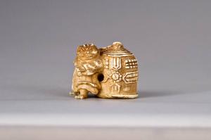 Okimono raffigurante Benkei con la campana del tempio Miidera sulle spalle; il monaco, con un'espressione corrucciata stampata sul volto, veste di un abito semplice e porta in testa la bandana hachimaki, di solito indossata per i lavori faticosi.
