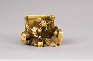 La composizione è divisa in due scene, separate l'una dall'altra grazie ad un paravento tsuitate: da un lato è presente un solo personaggio, con spada al fianco e lampada nella mano sinistra; ai suoi piedi si vede un cesto, mentre su un lato è presente un vaso caduto e sull'altro una scacchiera di go rovesciata. L'altra scena mostra invece un'altra figura che con la mano trattiene a terra un avversario, l'espressione del viso del quale esprime grande sofferenza.