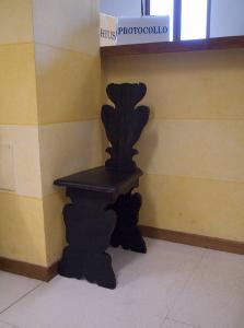 Sedia sostenuta da due assi sagomate e con alto schienale formato da un'asse sagomata.