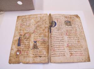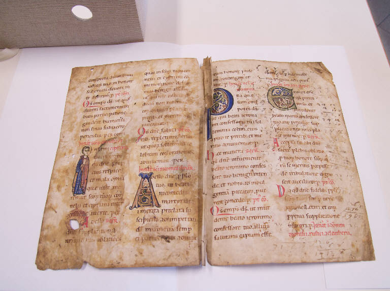 Foglio scritto su entrambi i versi, con testo distribuito su due colonne per pagina in scrittura minuscola carolina a due inchiostri, avente quattro capilettera per verso per un totale di otto capilettera.