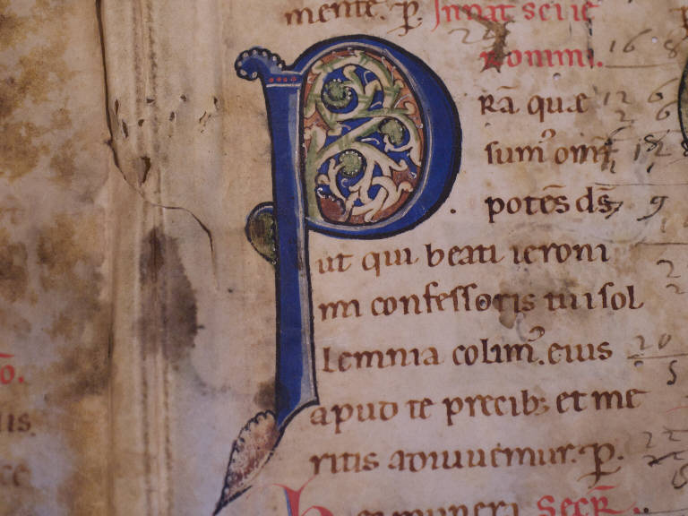Capolettera raffigurante la lettera P maiuscola dipinta in blu e lumeggiata di bianco, mentre l'interno della pancia è decorato a racemi intrecciati da rami in verde su fondo blu e rosso.