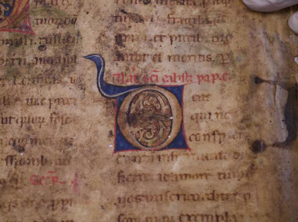 Capolettera raffigurante la lettera O maiuscola dipinta in blu. L'interno è riempito da racemi su fondo rosso.