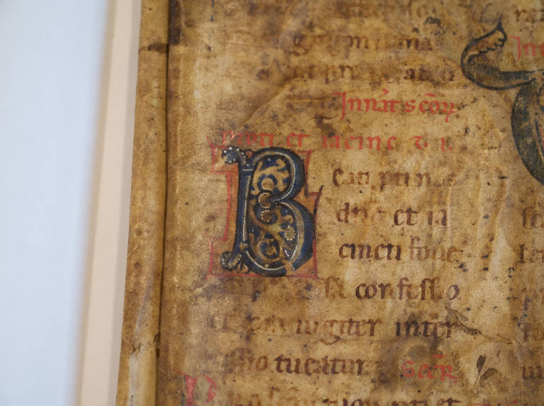 Capolettera raffigurante la lettera B maiuscola dipinta in blu incorniciata da un una linea rossa. L'interno è riempito da racemi su fondo blu con lumeggiature bianche a descrivere i fiori.