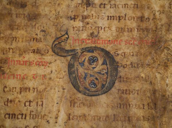 Capolettera raffigurante la lettera O maiuscola dipinta in verde e bordata di nero. L'interno è riempito da racemi su fondo blu e rosso con fiori a tre petali di color blu e lumeggiature bianche.