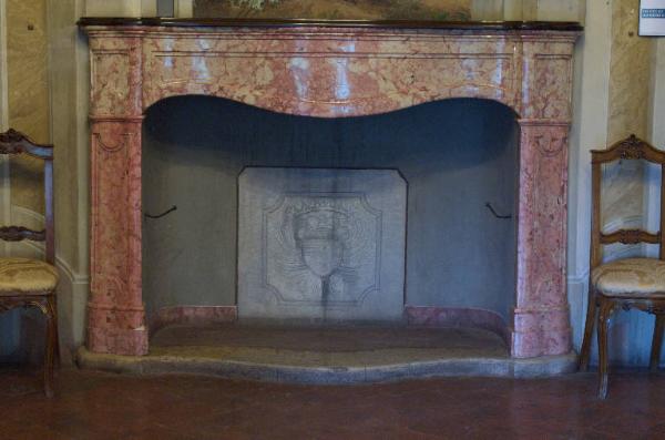 Mostra di camino dagli stipiti stondati e l'architrave modanato e bombato.