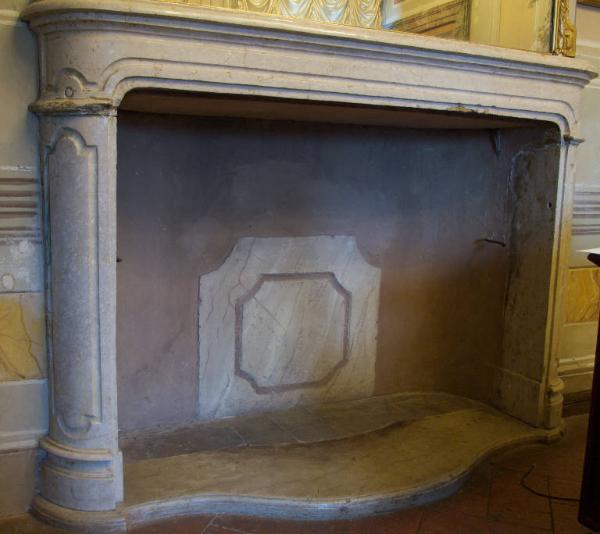 Mostra di camino su stipiti arrotondati decorati da cornici semplici come l'architrave.