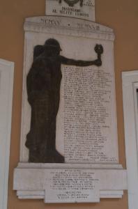 Lapide commemorativa con scritte a destra e rilievo in bronzo a sinistra, poggiante su predella modanata e chiusa da frontoncino centinato.