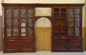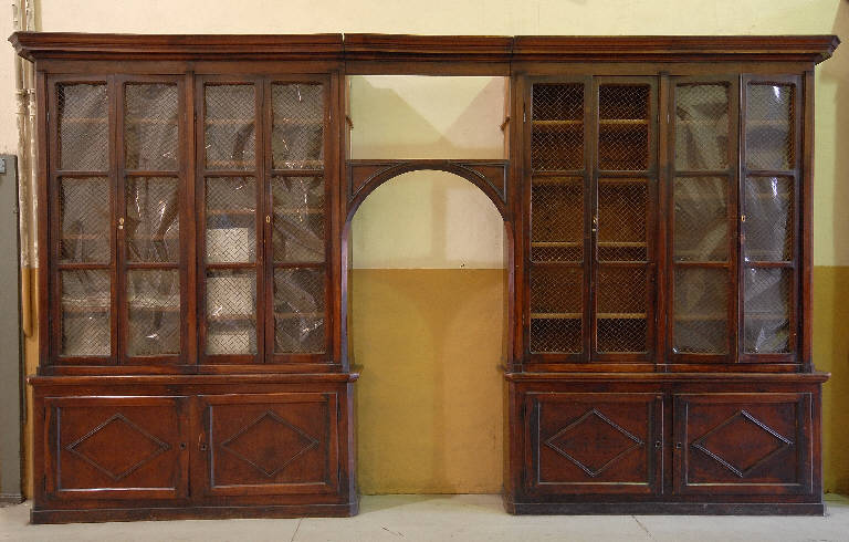I due mobili da biblioteca sono costiuiti da due corpi a doppio modulo raccordati da elemento con arco decorativo. La parte inferiore è caratterizzata da antine lignee con losanga. Superiormente presentano ante a vetri con rete metallica. Terminano con un cappello modanato. Sono presenti ripiani lignei interni e piedi a zoccolo smussato agli angoli. Sono caratterizzati da bocchette ovali in ottone con motivi decorativi incisi. I fianche delle due librerie sono lisci.