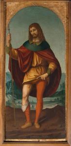 - NOTIZIE STORICO CRITICHE Guglielmo Lochis acquistò l'opera nel 1839 dal mercante Filippo Benucci. L'opera è lo scomparto laterale sinistro di un polittico dipinto ignoto di cui faceva parte anche un'altra tavola di Marco d'Oggiono raffigurante "San Sebastiano", oggi conservata nel Museo Poldi Pezzoli di Milano (INV 1640). Da alcuni considerato come copia antica da Marco d'Oggiono.