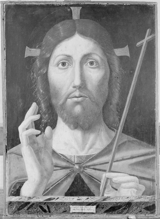 - NOTIZIE STORICO CRITICHE Si tratta dello scomparto, probabilmente la cimasa, di un polittico ignoto. La cornice, in legno modanato dipinto e dorato, è del XX secolo. L'opera è citata da G. Lochis nel 1858, che scrive: "Nostro Signore che benedice; mezza figura, col nome dell'autore e data", e da G. Morelli nel 1864, che scrive:"Non bella, ma rare le opere segnate da questo pittore, scolaro dei Muranesi, come si vede". Il dipinto richiama probabilmente un prototipo di Alvise Vivarini (Venezia, Chiesa di S. Giovanni in Bragora). G.C.F. Villa riporta la notizia incerta che la tavola sia giunta in collezione Lochis prima nel 1846 e che in quello stesso anno sia stata restaurata da Alessandro Brisson (in "I grandi Veneti", 2010, p. 66).