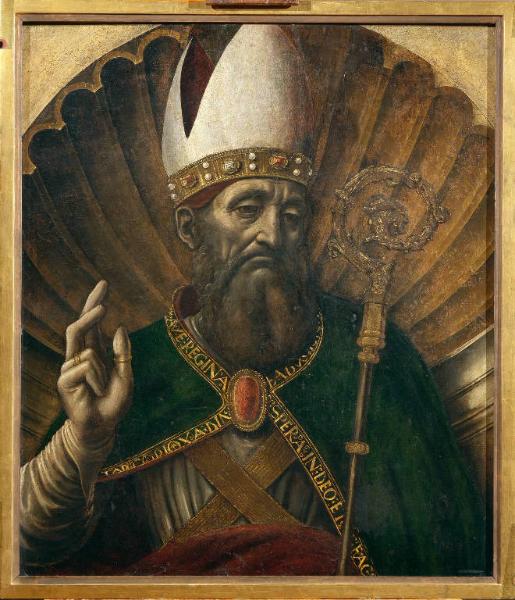 - NOTIZIE STORICO CRITICHE Opera sacra a destinazione pubblica. Il santo è stato identificato anche con Sant'Agostino. L'attribuzione al Maestro della Pala Sforzesca, avanzata da Francesco Rossi nel 1979, è dubitativa. La datazione non dovrebbe allontanarsi troppo dal 1495 circa, epoca cui appartiene il grande dipinto braidense attorno al quale è stata ricostruita questa anonima personalità artistica.