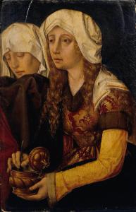 - NOTIZIE STORICO CRITICHE L'opera a destinazione pubblica è un frammento della Pala della Deposizione di Cristo nel sepolcro attribuita ad una scuola tedesca del XVI secolo di cui faceva parte anche "San Giuseppe d'Arimatea" (Bergamo, Accademia Carrara, num. inv. 81LC00078). L'iscrizione è parzialmente coperta da una traversa. L'opera con il suo pendant è stata attribuita da Mauro Lucco (com. orale, 19/02/1985) alla scuola fiamminga, anche se di confine con la Germania: sul confronto con gli sportelli dell'altare di Kalkar, eseguiti nel 1505, e col retablo di Palencia, di poco precedente lo studioso crede che le due opere spettino alla mano di Ian Joest.