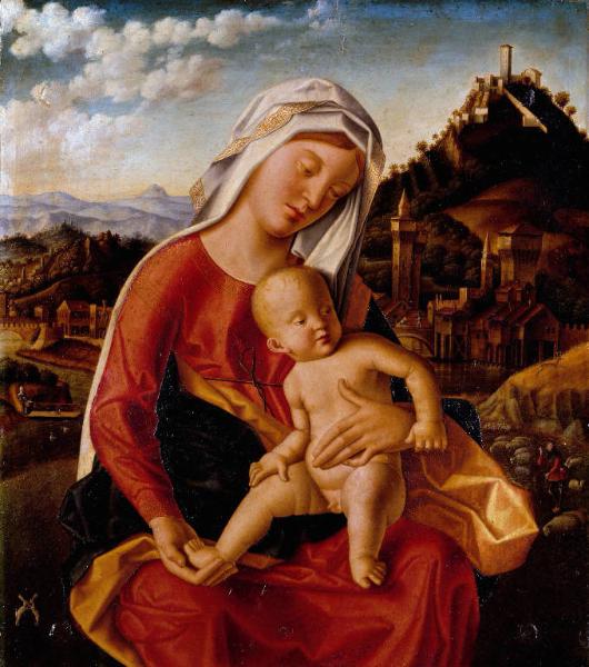 - NOTIZIE STORICO CRITICHE Opera sacra a destinazione privata. Il castello sul fondo è stato identificato con quello di Gradara. Il supporto è in legno di rovere. L'opera, già posseduta dal bresciano Paolo Brognoli (1763-1835), fu acquistata da Guglielmo Lochis nel 1841(G. Brambilla Ranise, 2007; G. Valagussa in "I grandi veneti", 2010).