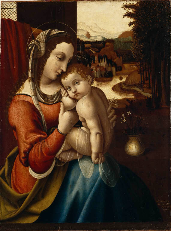 - NOTIZIE STORICO CRITICHE Opera sacra a destinazione privata. La tavola è citata da G. Lochis nel 1858 ("Bellissimo quadro avente la Beata Vergine col Bambino, e un paese. Ha il nome dell'autore e l'anno 1501,/ Dipinto in tavola, altezza metri 0,60.5, larghezza metri 0,44") e da G. Morelli nel 1864 ("E' pittore raro, sebbene dozzinale. In pregio del cartellino vale circa 25"). La cornice novecentesca è in legno intagliato e dorato. L'opera deriva nel volto della Madonna dalla Madonna Litta dell'Ermitage (Leonardo?), nella posizione del Bambino dalla Vergine delle Rocce di Leonardo della National Gallery di Londra. Dell'opera della Carrara esistono varie repliche, una autografa nella Collezione Ludwig Sommer di Siegsdorf, altre attribuite a Bernardino de' Conti alla Staatgalerie di Augsburg, allo Sterling and Francine Clark Art Institute di Williamstown, alla Staatgalerie di Schleissheim, in collezione privata veronese e una già in Collezione Cantoni a Milano; una di scuola lombarda e al Bayerische Staatsgemalde di Monaco. Una derivazione può essere riconosciuta nella "Madonna col Bambino" di Giovan Antonio Boltraffio già Collezione Crespi a Milano. Della composizione della Carrara esistono, inoltre, diverse varianti: una raffigurante il Riposo nella fuga in Egitto di Joos Van Kalkar a Liverpool alla Walker Art Gallery (inv. 1021); una raffigurante la Madonna del Latte e due Santi di scuola fiamminga a Providence (Rhode Island School of Design, inv. 596); un' altra Madonna del latte di scuola fiamminga a Ginevra (Musée d'Art et d'Histoire, inv. CR 229) e una di Bernardino de' Conti a Koblenz (Mittelrhhein Museum, inv. M 16). Una derivazione grafica è il disegno di scuola fiamminga conservato a Berlino (Kupferstichkabinett, inv. 12315).