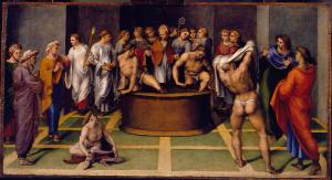 - NOTIZIE STORICO CRITICHE Si tratto di uno scomparto della "Pala di Sant'Agostino". Gli altri sono: "Disputa sull'Immacolata Concezione" (Milano, Pinacoteca di Brera, num. inv. 512); "Annunciazione" (Cesena, Chiesa di Sant'Agostino); "Sant'Agostino riveste i catecumeni" (Columbia, Columbia Museum of Art, num. inv. K113); "Conversione di Sant'Agostino" (Milano, già, Pinacoteca di Brera, già) e "Beati agostiniani". Opera sacra a destinazione pubblica acquistata da Guglielmo Lochis dopo il 1835. Giovanna Brambilla Ranise in "La raccolta dimezzata. Storia della dispersione della pinacoteca di Guglielmo Lochis (1789-1859)" riporta come data di acquisizione alla collezione Lochis il 1836.