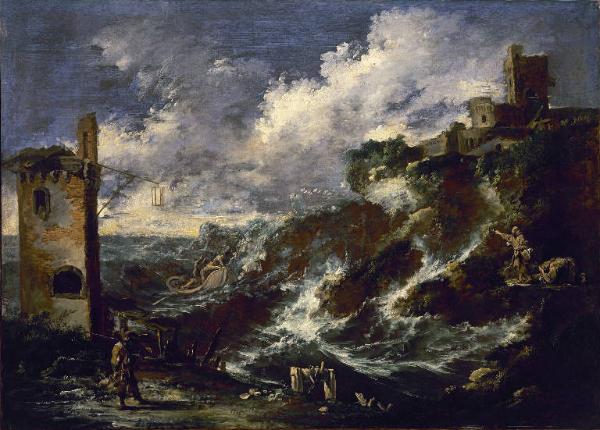 - NOTIZIE STORICO CRITICHE Le figure sono attribuite al genovese Alessandro Magnasco, mentre la "burrasca", a pennellate rapide e sfrangiate, rimanda a un possibile intervento del marchigiano Antonio Francesco Peruzzini, che fu un collaboratore sistematico del Magnasco. L'opera, facente parte del legato della nobildonna Sandra Maria Volpi Bassani D'Amico, deceduta nel 1989, fu acquisita dall'Accademia Carrara nel 1996.