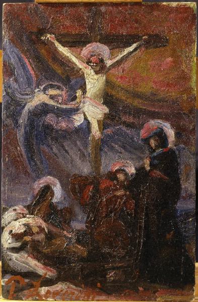 - NOTIZIE STORICO CRITICHE Si tratta del bozzetto per la pala d'altare dell'antica chiesa di S. Maria in Monte Santo nel vecchio Seminario vescovile di Bergamo (oggi nel Seminario Vescovile Giovanni XXIII). La pala è datata 1918. A tergo è abbozzato un paesaggio montano. Al Museo Diocesano di Bergamo è conservato un altro bozzetto della medesima pala, mentre in collezione Rudelli a Gandino è presente un disegno preparatorio.