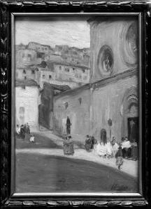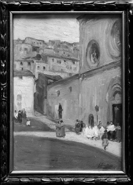 Veduta di chiesa con processione funebre