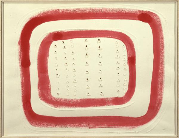 - NOTIZIE STORICO CRITICHE Il dipinto fa parte di un gruppo di opere di arte moderna donate all'Accademia Carrara dal critico d'arte Davide Cugini in memoria del figlio Aldo. Tutta la serie dei "Concetti spaziali" di Lucio Fontana, in cui il segno-gesto buca tele, carte e carte telate, deriva in sostanza dalle esperienze dell'artista come scultore e ha inizio nel '49: l'oggetto artistico non è più "cosa" bensì "luogo" plastico percepito in un determinato tempo. Il bucare la tela è il gesto fondamentale dell'arte spaziale che con questo gesto di rottura della superficie pittorica scardina la bidimensionalità della tela e permette al vuoto al di là della tela di entrare nella composizione. I buchi non sono che i fori della serratura da cui l'arte guarda la vita vera, l'unica che valga la pena di vivere. Il gesto dell'artista non è definibile come pittorico o scultoreo, ma si propone come atto di conoscenza, ed è per questo che tali opere vengono definite "Concetti spaziali". Nelle opere di Fontana di questo periodo i buchi o i tagli non hanno un'organizzazione casuale ma sempre molto calibrata, in rapporto a una riflessione sull'architettura o sull'organizzazione presente in altre opere, come ad esempio in quelle di Mondrian. A questa ricerca di Fontana si collegano numerosi disegni che non sono mai però progetto per un'opera precisa, ma documentano quanto lavoro è necessario per arrivare all'assoluto, al gesto primario del "taglio" o del "foro". L'opera in oggetto, caratterizzata da una doppia cornice che incornicia teorie verticali di fori, si collega alla serie detta "Teatrini", prodotta dal 1964 al 1966, in cui il contrasto tra le sagome di contorno in legno laccato e i fondali di tela con buchi sembra tendere alla terza dimensione.