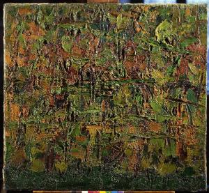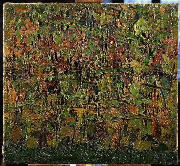 - NOTIZIE STORICO CRITICHE Morlotti espose nel 1946 un primo piccolo nucleo di paesaggi, intitolati "Dossi", in cui manifestava il profondo confronto con il tema del mondo naturale caratteristico della pittura di Morlotti tra il quinto e il sesto decennio del secolo. Nel 1951 inaugura un nuovo modo di vedere la natura tra astrattismo e osservazione della realtà che troverà il suo compimento in occasione della XXVII Biennale veneziana del 1954: da questo momento fino al 1960 si immerge totalmente nella natura utilizzando una ricca materia cromatica stesa con pennello e spatola e dà corpo a ciò che lui stesso definisce il "sentimento dell'organico". A questa fase, a cui appartiene il dipinto in oggetto, risalgono importanti cicli di opere, dedicati al tema dei fiori, delle bagnanti e soprattutto del fiume Adda a Imbersago, dove Morlotti visse e lavorò a fasi alterne tra il 1955 e il 1965. A parte il riferimento alla linea dell'orizzonte che sovrasta la vegetazione, che rimane l'unico ancoraggio all'osservazione iniziale, per il resto il pittore penetra nei particolari delle foglie, dei fili d'erba e nella vita che si svolge dentro la natura, il "lato organico" appunto. Dopo il 1960 l'autore sostituisce l'immersione nella natura con un osservazione riportata fuori della rappresentazione e il paesaggio torna ad assumere gradualmente nettezza di contorni.