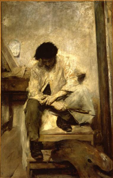 - NOTIZIE STORICO CRITICHE Il dipinto raffigura il padre Luigi Locatelli, affreschista, che lavorando ad affresco in una chiesa di Ornica è afflitto per i dolori di una caduta sul lavoro che non gli permettono di proseguire. A quest'opera fu assegnata la medaglia d'argento del Ministero dell'Educazione nazionale alla V Esposizione Triennale della Carrara.