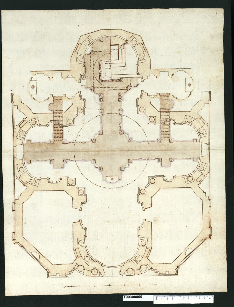 disegno in scala che conserva tracce della preliminare costruzione a grafite; è eseguito a inchiostro bruno a penna, principalmente con tiralinee e compasso; campiture di acquerello beige nello spessore delle murature e in corrispondenza della pianta della cripta; il supporto sul quale è tracciato è di carta avorio
