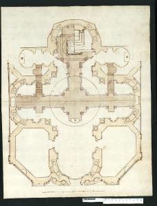 - NOTIZIE STORICO CRITICHE Nell'"Indice" del tomo nel quale era rilegato il disegno viene definito: "D.a per accrescimento di chiesa".\nIl disegno si riferisce alla chiesa dei SS. Luca e Martina a Roma, progettata da Pietro da Cortona e costruita a partire dal 1635. Ubicata presso l'arco di Settimio Severo, la chiesa di S. Martina era stata donata da Sisto V nel 1588 all'Accademia di S. Luca i cui membri da quel momento iniziarono a riunirsi in due stanze adiacenti il prospetto del piccolo edificio ad aula (cfr. Milano, Collezione Sardini Martinelli inv. 1,27a). Ben presto si manifestò la necessità di ricostruire l'edificio religioso, come testimoniano alcuni disegni di Ottaviano Mascherino. Accantonata per alcuni anni, l'idea viene ripresa, secondo Karl Noehles (1970), tra il 1623 e il 1634, quando Pietro da Cortona elabora, di propria iniziativa, un progetto di chiesa a pianta centrale.\nNel luglio 1634 Pietro ottiene dall'Accademia l'autorizzazione a sistemare "a suo gusto" la cappella sotterranea. Durante gli scavi si rinvengono i corpi dei martiri Martina, Epifanio e Concordio, da questo momento il cardinale protettore Francesco Barberini e papa Urbano VIII decidono di elargire fondi per la ricostruzione della chiesa, il cui nuovo progetto dovette essere elaborato tra la fine del 1634 e l'inizio del 1635. A breve vennero edificati l'abside e l'altare maggiore, mentre sono documentati lavori nella cripta negli anni Quaranta.\nNel 1648 con il ritorno a Roma del cardinale Francesco Barberini (fuggito in Francia nel gennaio 1646), e nella speranza di nuovi contributi economici per completare la chiesa, Pietro da Cortona elabora un piano di ristrutturazione dell'area complessiva della chiesa superiore, riprendendo l'idea di sviluppare liberamente l'edificio su almeno tre lati. I progetti di tale ristrutturazione sono tramandati in due piante conservate in Milano, Collezione Sardini Martinelli, questo e inv. 1,9. \nLa pianta del presente disegno mostra i due livelli sovrapposti della chiesa superiore e inferiore, nelle reciproche relazioni: si può notare come l'ottagono centrale sia riproposto in dimensioni ridotte anche nella chiesa inferiore. \nGli ambienti minori adiacenti al braccio del presbiterio sono pensati come cappelle simmetriche di cui quella di destra, dedicata a S. Lazzaro costruita, prima del 1651, mentre quella di sinistra non fu mai realizzata secondo questo progetto. La disposizione degli ambienti al piano inferiore risulta complessa: le due scale che partono dai piccoli ambienti antistanti le cappelle e sboccano nella chiesa inferiore si sviluppano su di un asse rettilineo, con pianerottolo intermedio con parete a nicchia. Le rampe giungono al piano inferiore in corrispondenza di un lungo corridoio, il cui asse corrisponde all'asse trasversale della chiesa superiore. In corrispondenza degli sbocchi delle rampe sono inserite, sul lato opposto del corridoio, delle nicchie rettangolari con colonne incassate negli angoli. Il vestibolo della "confessio" e della vecchia cappelletta di S. Martina, assume la forma di vano ottagonale con pilastri tagliati in diagonale e delimitati da colonne incastrate negli angoli (Noehles 1970, pp. 106-107).\nInoltre va evidenziato come in sostituzione delle campate esterne allineate alla zona centrale della facciata (così come appaiono nella pianta di Domenico Castelli conservata nella Biblioteca Vaticana, in Noehles 1970, p. 120 fig. 84b) si hanno qui due tratti di parete sempre delimitati da lesene che, inclinandosi di 45°, collegano la zona centrale ai fianchi dell'edificio (anche in Milano, Collezione Sardini Martinelli inv. 1,9).\nTutti i disegni della Collezione Sardini Martinelli sono stati ritenuti da Noehles copie di originali di Pietro da Cortona, che Domenico Martinelli avrebbe eseguito all'Accademia di S. Luca verso la fine del Seicento (durante il soggiorno romano del 1678-1690). Tale attribuzione è stata messa in dubbio da Lorenz (1991 p. 320). A suo avviso sono poche le corrispondenze con la tecnica disegnativa di altri sicuri disegni di Martinelli, per confermargli questi elaborati, quindi non ritiene di condividere in tutti i casi le opinioni di Noehles (1970, nota 115), secondo cui tutti i disegni di questo tomo correlati a Cortona, sono da vedere come disegni di Martinelli.