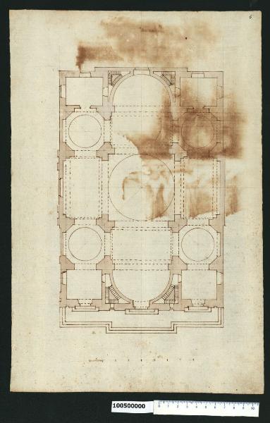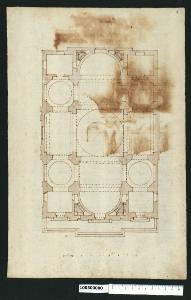- NOTIZIE STORICO CRITICHE Nell'"Indice" del tomo nel quale era rilegato il disegno viene definito: "Chiesa per Frascati".\nIl foglio fa parte di una serie di copie da disegni di Ottaviano Mascherino redatta da Domenico Martinelli durante il suo soggiorno romano (1678-1690) e si riferisce ad un progetto per la Cattedrale di S. Pietro a Frascati. Per la medesima chiesa, Mascherino aveva redatto un altro disegno, attualmente conservato nel fondo Mascherino dell'Accademia di S. Luca a Roma ( scheda di catalogo dell'Accademia n. 2543, datato al 1598) e anch'esso copiato da Martinelli (Milano, Collezione Sardini Martinelli inv. 4,27). Alla base del presente disegno Noehles (1970, p. 43) riconosce gli studi di Mascherino relativi al problema di dar forma centralizzata a uno spazio longitudinale. Per il duomo di Frascati, l'architetto riprende lo schema della chiesa a pianta centrale a cinque cupole esemplificato nei SS. Celso e Giuliano di Bramante, da cui ricava un edificio orientato longitudinalmente sopprimendo delle quattro absidi le due situate nei bracci trasversali.