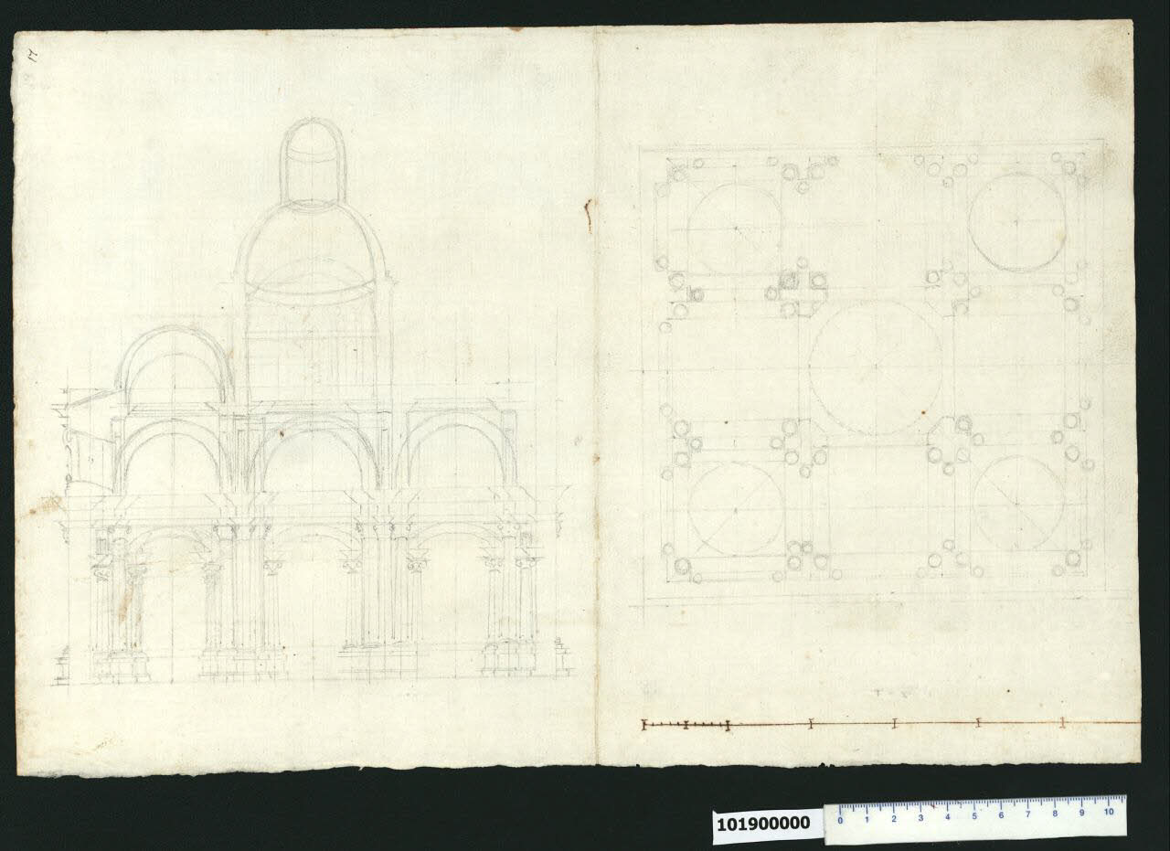 - NOTIZIE STORICO CRITICHE Nell'"Indice" del tomo nel quale era rilegato il disegno viene definito: "Pianta e spaccato di Chiesa".\nNon è stato possibile identificare l'autore del disegno, né la chiesa qui rappresentata a grafite in pianta e sezione. Di impianto centrale, basata su una suddivisione in nove moduli quadrati di un quadrato, la chiesa è caratterizzata da pilastri compositi a L agli angoli, a T lungo i lati e cruciformi al centro, cui sono addossate colonne sia ai vertici sia negli angoli interni. Tra le colonne più basse poste ai vertici dei pilastri sono sottesi archi ribassati, mentre le colonne più alte poste agli angoli sorreggono attraverso una trabeazione degli archi a tutto sesto e quindi un sistema di coperture a cupola nei moduli ai vertici del quadrato e a volta nei moduli laterali. Il modulo centrale è coperto da una cupola più grande rialzata da un tamburo e sormontata da un lanternino. La sezione è incompleta ma consente la lettura della composizione. L'illuminazione della chiesa è garantita da una apertura nella spessa muratura, forse ripetuta sugli altri lati, a livello degli archi a tutto sesto.