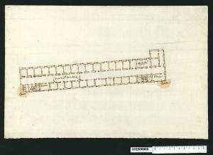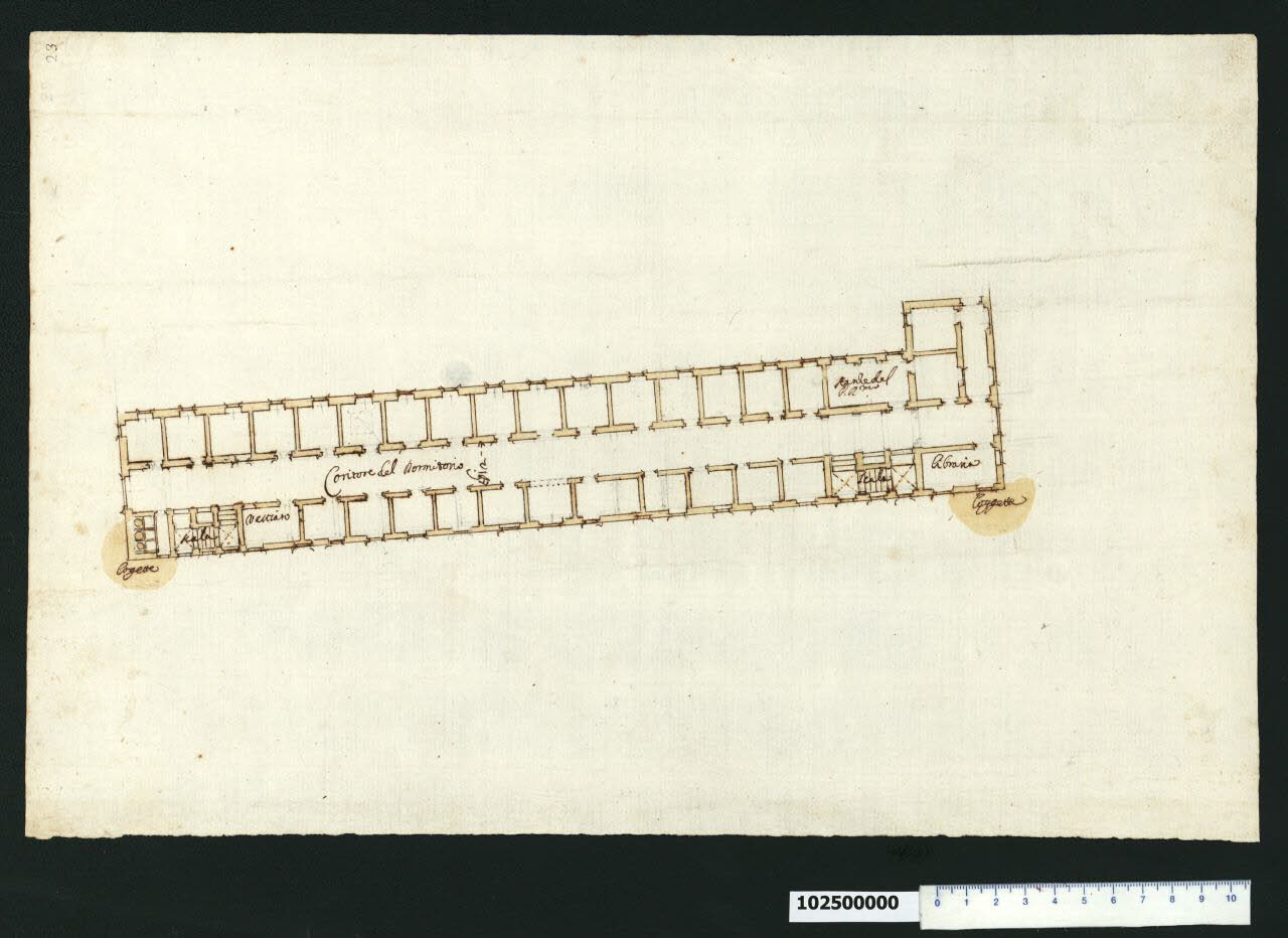 - NOTIZIE STORICO CRITICHE Nell'"Indice" del tomo nel quale era rilegato il disegno viene definito: "D.a d'un Dormitorio vedi 2.15".\nIl disegno riporta la pianta del dormitorio situato al piano superiore dell'ala sinistra del monastero raffigurato in altri disegni rilegati nello stesso tomo (Milano, Collezione Sardini Martinelli invv. 1,2; 1,16 R e V). Tra le celle dei monaci allineate lungo il corridoio centrale, sono segnalati i locali comuni, ossia il guardaroba ("vestiaro") e la biblioteca ("libraria"), nonché le stanze del Priore. In corrispondenza delle torri, accennate con un segno ad acquerello, si trovano delle loggette.\nNon si è potuto individuare il monastero, né l'autore del disegno, che appartiene all'ambito romano a cavallo tra il XVI e il XVII secolo, alla luce delle iscrizioni riportate sul foglio e della scala metrica in palmi riportata sui disegni di cui sopra relativi allo stesso soggetto.
