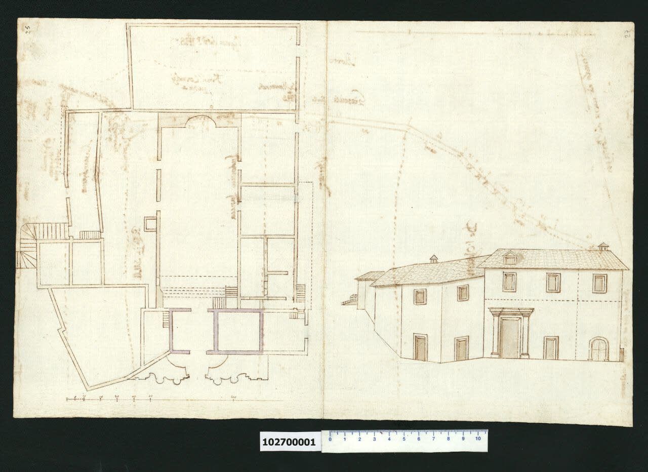 Pianta e prospetto della prima chiesa dei SS. Luca e Martina a Roma e case adiacenti. Pianta e prospetto della prima chiesa dei SS. Luca e Martina a Roma e case adiacenti