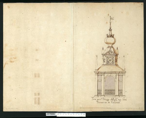 - NOTIZIE STORICO CRITICHE Nell'"Indice" del tomo nel quale era rilegato il disegno viene definito: "D.a per il Palazzo del gran Tesoriero di Varsavia" (leggi: "Torre per il Palazzo del gran Tesoriero di Varsavia").\nIl presente disegno si riferisce al palazzo di Boguslaw Leszczynski gran tesoriere di corte durante il regno di John Casimir Wasa. Fu costruito negli anni 1650-54 su progetto di Giovanni Battista Gisleni, in un luogo appena fuori della città di Varsavia. Più volte distrutto venne riedificato e ridisegnato in stile neoclassico su progetto dell'architetto italiano Antonio Corazzi all'inizio del XIX secolo.\nIl progetto originario è stato riconosciuto da Nina Miks Rudkowska (1984) in due disegni conservato in Milano, Collezione Sardini Martinelli, inv. 1,7 e 1,37b.\nIl prospetto della torre con orologio, posta probabilmente sopra l'ingresso principale, unisce al partito a serliana di derivazione cinquecentesca (un esempio è rintracciabile nel disegno di Ottaviano Mascherino per l'altana del palazzo del Quirinale) un elemento costruttivo locale come il coronamento a bulbo cuspidato (Bevilacqua 2001, p. 622).