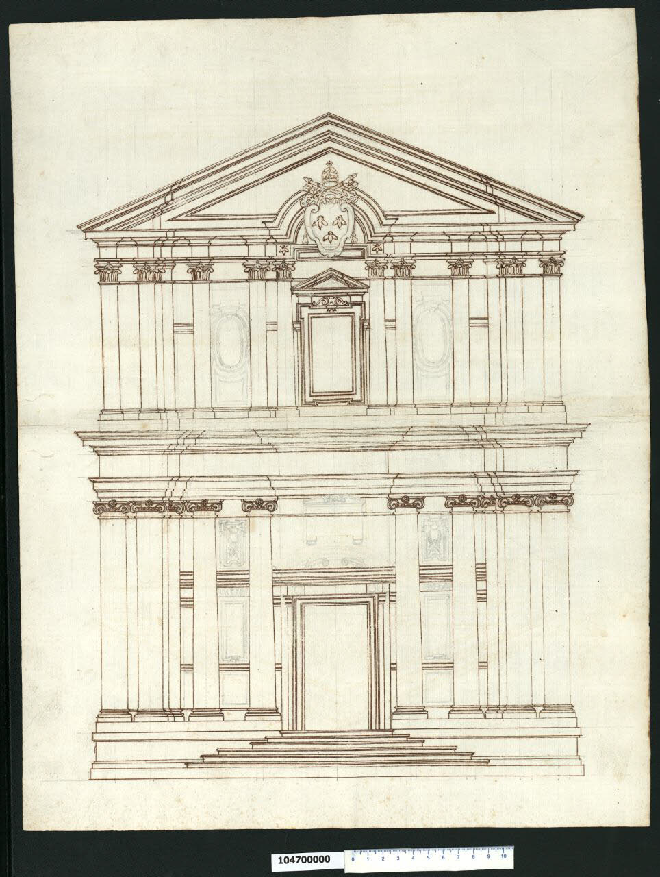 - NOTIZIE STORICO CRITICHE Nell'"Indice" del tomo nel quale era rilegato il disegno viene definito: "Facciata di Chiesa".\nIl disegno si riferisce alla chiesa dei SS. Luca e Martina a Roma, progettata da Pietro da Cortona e costruita a partire dal 1635. Ubicata presso l'arco di Settimio Severo, la chiesa di S. Martina era stata donata da Sisto V nel 1588 all'Accademia di S. Luca i cui membri da quel momento iniziarono a riunirsi in due stanze adiacenti il prospetto del piccolo edificio ad aula (cfr. Milano, Collezione Sardini Martinelli inv. 1,27a). Ben presto si manifestò la necessità di ricostruire l'edificio religioso, come testimoniano alcuni disegni di Ottaviano Mascherino. Accantonata per alcuni anni, l'idea viene ripresa, secondo Karl Noehles (1970), tra il 1623 e il 1634, quando Pietro da Cortona elabora, di propria iniziativa, un progetto di chiesa a pianta centrale.\nNel luglio 1634 Pietro ottiene dall'Accademia l'autorizzazione a sistemare "a suo gusto" la cappella sotterranea. Durante gli scavi si rinvengono i corpi dei martiri Martina, Epifanio e Concordio, da questo momento il cardinale protettore Francesco Barberini e papa Urbano VIII decidono di elargire fondi per la ricostruzione della chiesa, il cui nuovo progetto dovette essere elaborato tra la fine del 1634 e l'inizio del 1635.\nIl disegno originale di Cortona relativo al prospetto della chiesa va datato con ogni probabilità intorno al luglio 1635, quando risultava ormai evidente che l'Accademia non era in grado di acquistare i terreni necessari per costruire l'edificio secondo le dimensioni previste all'inizio, cioè con l'accorpamento delle case laterali (sulle vicende dell'acquisto delle aree limitrofe cfr Milano, Collezione Sardini Martinelli inv. 1,27a). Nel giugno 1637 la parte inferiore della facciata era già compiuta sino all'altezza del cornicione, mentre la costruzione del piano superiore iniziò prima del gennaio 1639.\nIl prospetto è impostato su due ordini sovrapposti, verticalmente definiti da due settori piani articolati con paraste binate, che sembrano stringere la parte centrale leggermente convessa scandita da colonne annegate nella muratura. La soluzione è ripetuta in senso inverso al piano superiore: alle colonne del pianterreno corrispondono le lesene del primo piano, alle lesene appena accennate che sovrastano il portale di ingresso fanno riscontro le colonne che inquadrano il finestrone. La trabeazione superiore si spezza con aggetti in corrispondenza di lesene e pilastri ed è interrotta al centro da un arco davanti a cui è collocato lo stemma di Urbano VIII. Un grande timpano triangolare raccoglie sotto di se tutta la zona centrale della facciata. L'arco centrale è staccato dalla superficie del timpano, e costituisce una interpretazione molto libera dell'antico motivo dell'arco siriano.\nTutti i disegni della Collezione Sardini Martinelli sono stati ritenuti da Noehles copie di originali di Pietro da Cortona, che Domenico Martinelli avrebbe eseguito all'Accademia di S. Luca verso la fine del Seicento (durante il soggiorno romano del 1678-1690). Tale attribuzione è stata messa in dubbio da Lorenz (1991 p. 320). A suo avviso sono poche le corrispondenze con la tecnica disegnativa di altri sicuri disegni di Martinelli, per confermargli questi elaborati, quindi non ritiene di condividere in tutti i casi le opinioni di Noehles (1970, nota 115), secondo cui tutti i disegni di questo tomo correlati a Cortona, sono da vedere come disegni di Martinelli.