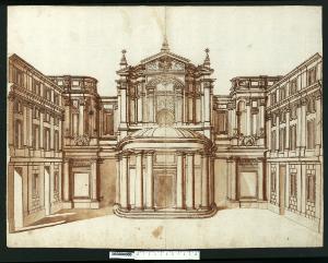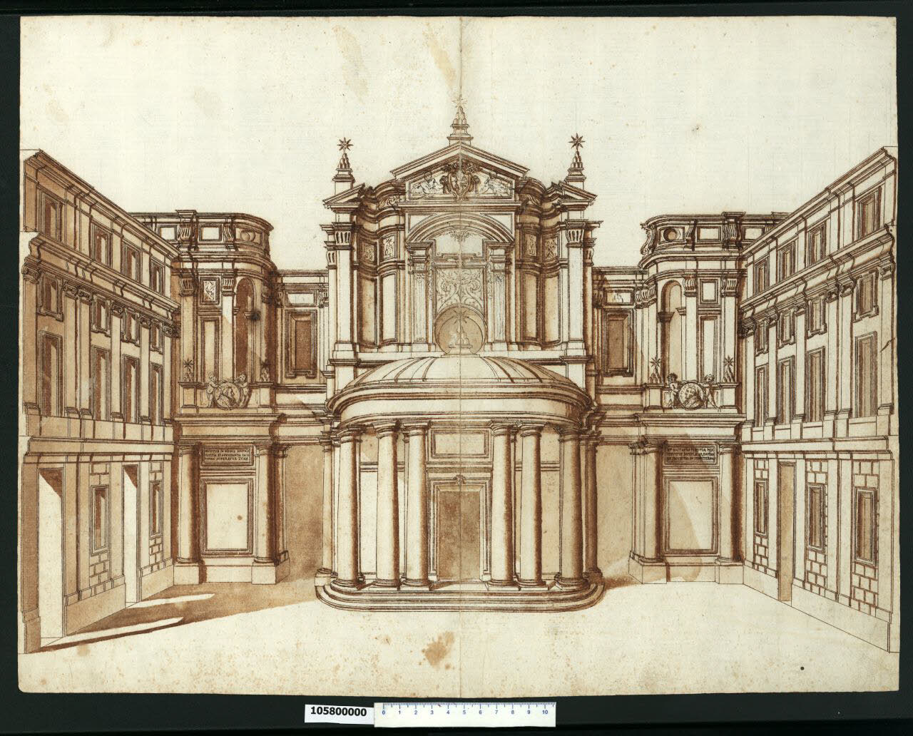 - NOTIZIE STORICO CRITICHE Nell'"Indice" del tomo nel quale era rilegato il disegno viene definito: "Facciata come al N° 37.38.50.53".\nIl presente disegno unitamente a quelli in Milano, Collezione Sardini Martinelli inv. 1,42 e 1,44, si riferisce al progetto di rinnovo interno e di trasformazione esterna della facciata della quattrocentesca chiesa di S. Maria della Pace a Roma, unitamente al ridisegno della piazza antistante e degli edifici prospicienti. L'intervento inaugura le opere cortoniane sotto il pontificato di Alessandro VII Chigi, divenuto papa il 7 aprile 1655, e si inserisce nel programma di riqualificazione dei "luoghi chigiani", in particolare di quelli connessi alle sepolture di famiglia. I lavori furono condotti tra il febbraio 1656 e il 1658, inizialmente secondo un programma limitato alla sistemazione interna della chiesa, mentre per l'esterno era prevista solo l'aggiunta di un portico. A livello urbanistico Cortona opera una ridefinizione globale della piazza mediante opportune demolizioni e successivi riadattamenti riguardanti non solo la facciata della chiesa e i passaggi alle vie laterali, ma anche i prospetti dei palazzetti che delimitano il piccolo invaso urbano.\nGli studi prospettici della raccolta Sardini Martinelli, pubblicati da Portoghesi per la prima volta nel 1966, testimoniano, appunto, il progressivo avvicinamento alla definitiva configurazione della facciata della chiesa. Nei tre disegni mentre gli edifici ai lati della piazza rimangono sostanzialmente identici tutti gli elementi del fondale variano. \nPer quanto riguarda il portico e le parti laterali del primo ordine, nel presente foglio e in quello inv. 1,44, si nota la variazione della curvatura del portico che non è più a profilo semi-ovale come nel disegno inv. 1,42, ma risulta appiattiva al centro da un inserto rettilineo.\nNel secondo ordine della facciata le varianti fra i tre disegni sono più evidenti e riguardano sia la parte centrale che i raccordi con le quinte laterali della piazza. In questo disegno l'architetto ha operato un lavoro di scavo della massa muraria in modo molto vicino alla soluzione definitiva (Portoghesi 1966,p. 232).