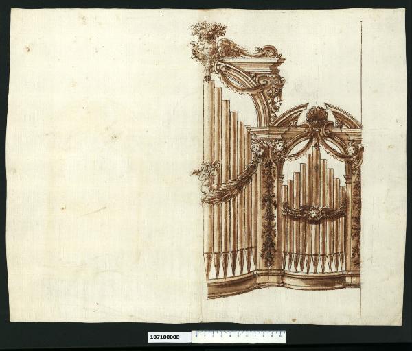 - NOTIZIE STORICO CRITICHE Nell'"Indice" del tomo nel quale era rilegato il disegno viene definito: "Organo".\nIl foglio in esame riporta la rappresentazione della metà destra di una cantoria, ossia una struttura lignea decorata ad intaglio per canne d'organo, essendo la sinistra probabilmente speculare. Diversi artisti si occuparono della progettazione di cantorie di questo tipo per le chiese tra il XVI secolo e il XVIII secolo; tra di essi ad esempio Giovanni Battista Montano, di cui sono presenti disegni all'interno del tomo V della Collezione (Milano, Collezione Sardini Martinelli invv. 5,28; 5,53; 5,55 e 5,56) che però non sembrano avere caratteristiche affini a questo.\nLa struttura intera è composta da tre campiture ad arco, di cui le laterali, più basse, sono completate superiormente da un frontone curvilineo spezzato inframmezzato da una conchiglia appoggiata alle volute di un cartiglio, mentre quella centrale, più alta, termina con una trabeazione che si evolve al culmine dell'arco nella voluta di un cartiglio su cui poggia la testina di un cherubino che sostiene un vaso di fronde. La struttura è oltremodo decorata con drappi sottesi tra volute o testine di cherubini, che fungono da sostegno degli elementi su cui sono impostati gli archi e ghirlande di nastri e motivi vegetali che scendono lungo gli elementi verticali della struttura. Anche le canne dell'organo riportano una decorazione nella parte mediana: una testina di cherubino con ali spiegate per le canne laterali e una figura intera di cherubino che suona un violino, appoggiato a un festone di fronde, per le canne centrali. Il disegno è da porre in relazione con un altro interno al tomo I della presente Collezione (Milano, Collezione Sardini Martinelli inv. 1,73).