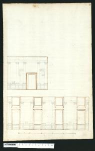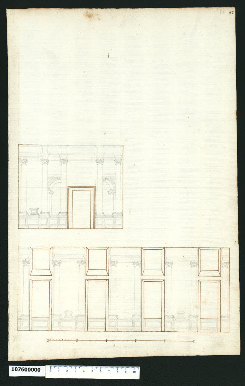 - NOTIZIE STORICO CRITICHE Nell'"Indice" del tomo nel quale era rilegato il disegno viene definito: "Schizzo di Galleria".\nIl disegno che non è stato possibile identificare, si riferisce alla decorazione parietale di una sala. Sulle pareti tra le finestre e attorno alla porta (tracciate a china sul disegno) è delineata a matita la struttura architettonica di un loggiato/porticato costituito da un parapetto che funge da basamento a colonne di ordine ionico che reggenti una trabeazione. Sul basamento, ornato da semplice specchiature che proseguono anche all'interno del parapetto delle finestre, sono posti tra le due colonne dei piedistalli. Ai lati della porta la decorazione si arricchisce con l'inserimento di due arcate in prospettiva. Il disegno rappresenta una sorta di matrice che verrà poi ulteriormente definita nel disegno in Milano, Collezione Sardini Martinelli inv. 1,77.