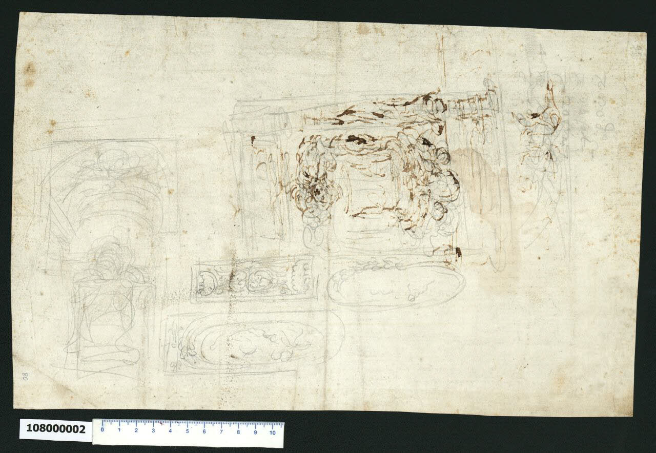 - NOTIZIE STORICO CRITICHE Lo schizzo che non è stato possibile identificare, raffigura un riquadrato racchiuso lateralmente da cariatidi che reggono un'alta cornice; all'interno del riquadro è raffigurato un cartiglio con un putto alato alla base e, sembrerebbe, due angeli adagiati sopra un fronte curvilineo che reggono uno scudo. Nella parte inferiore del foglio è velocemente delineato uno spazio prospettico coperto da volta a botte. Ai lati di questi due disegni sono tracciate a matita tre di decorazioni con elementi vegetali e volute contenute entro cornici rettangolari ed ellittiche.